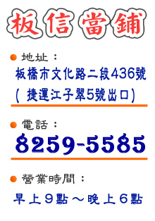 本專業當舖是一家政府立案、合法經營的優質當舖,除了提供各式流當品拍賣,更提供汽機車借款免留車、黃金借款、鑽石借款、名錶借款、工商融資.代償高利.資金週轉.黃金.鑽石.名錶.萬物皆可典當......等服務項目,我們以最熱誠的服務,提供急需週轉的工商朋友最便利的借錢手續,利息比照公營當舖。
